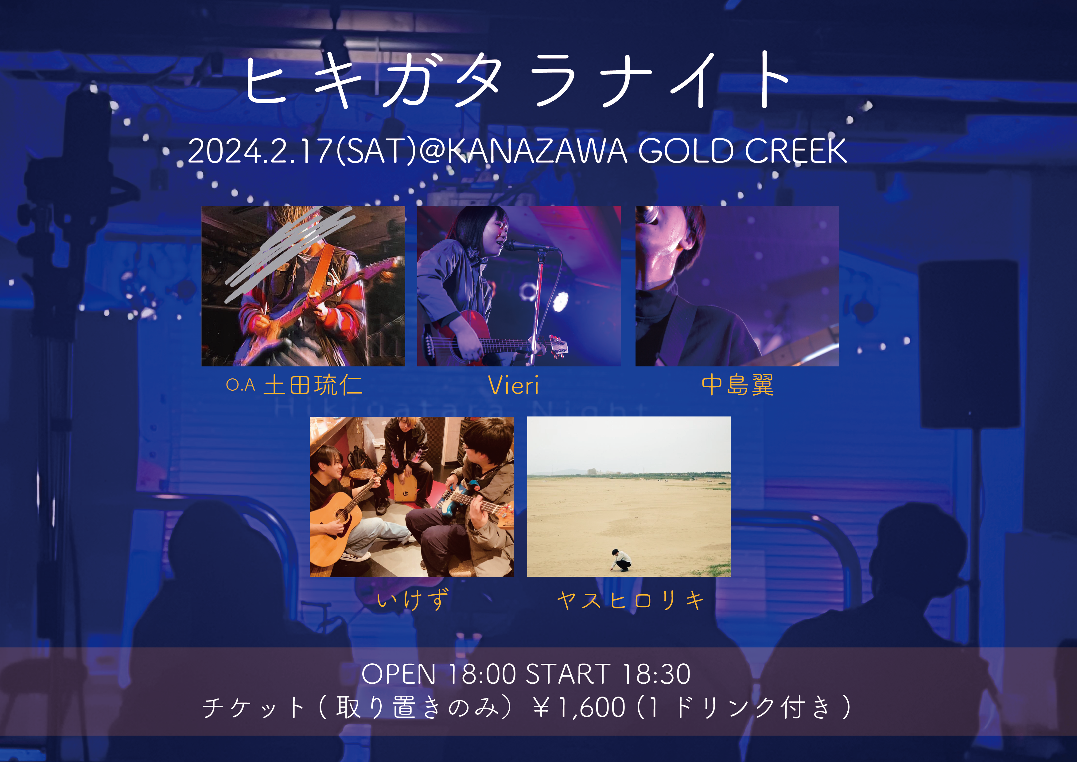 02/ 17 Sat ヒキガタラナイト チケット 取り置き・当日受付 ARTIST Vieri/中島翼/いけず/ヤスヒロリキ/O.A土田琉仁 ADV/DOOR ¥1600 / ¥ ドリンク付き OPEN/START 18:00 / 18:30