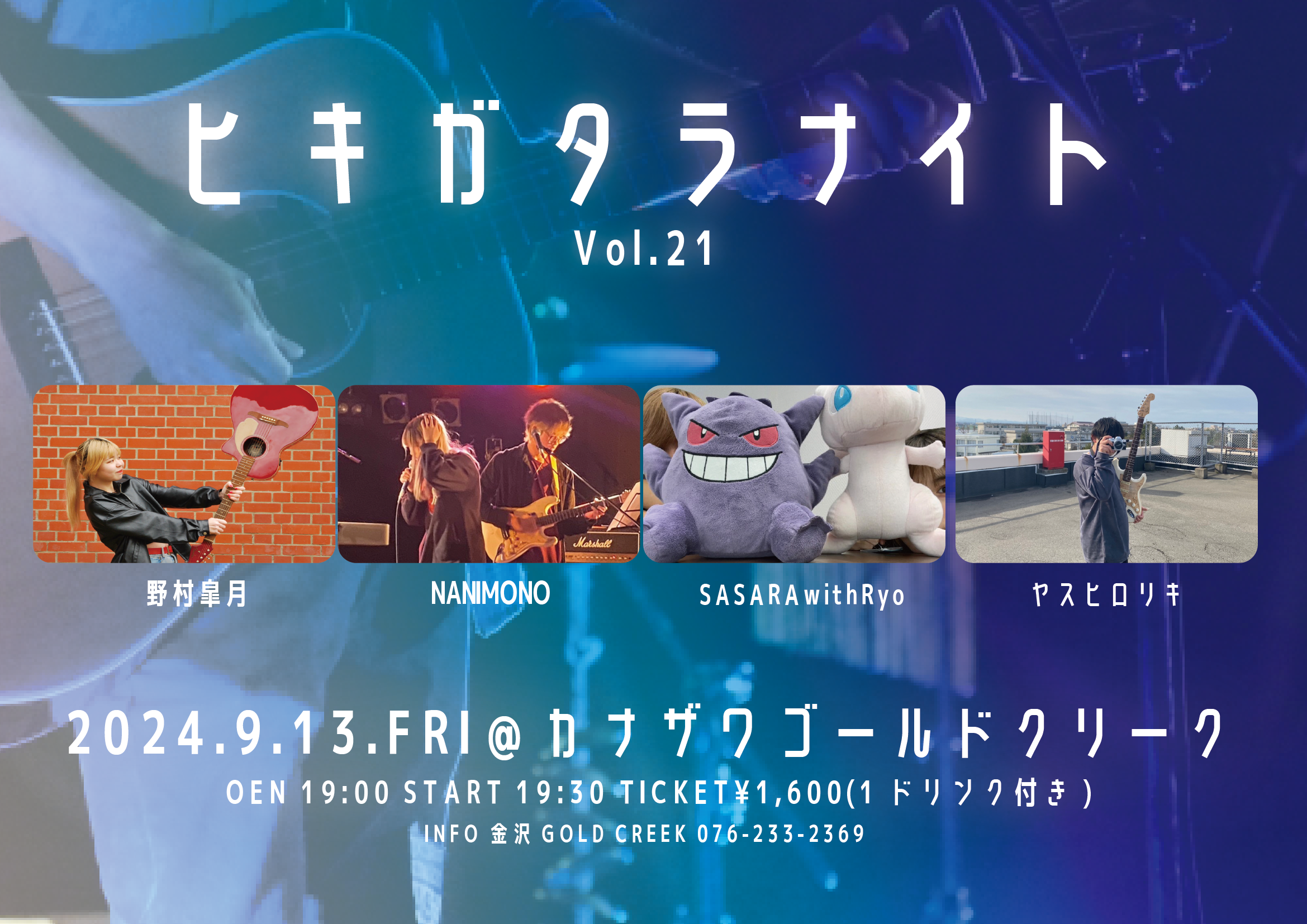 09/ 13 Fri ヒキガタラナイトvol.21 ARTIST 野村皐月/ NANIMONO /SASARAwithRyo /ヤスヒロリキ ADV/DOOR ¥1600 / ¥ ドリンク付き OPEN/START 19:00 / 19:30