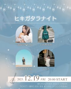 12/ 19 Fri ヒキガタラナイト チケット 出演者取り置き・又は当日受付 ARTIST ADV/DOOR ¥一般2,000/学生1,600 / ¥ ドリンク代込み OPEN/START 19:30 / 20:00